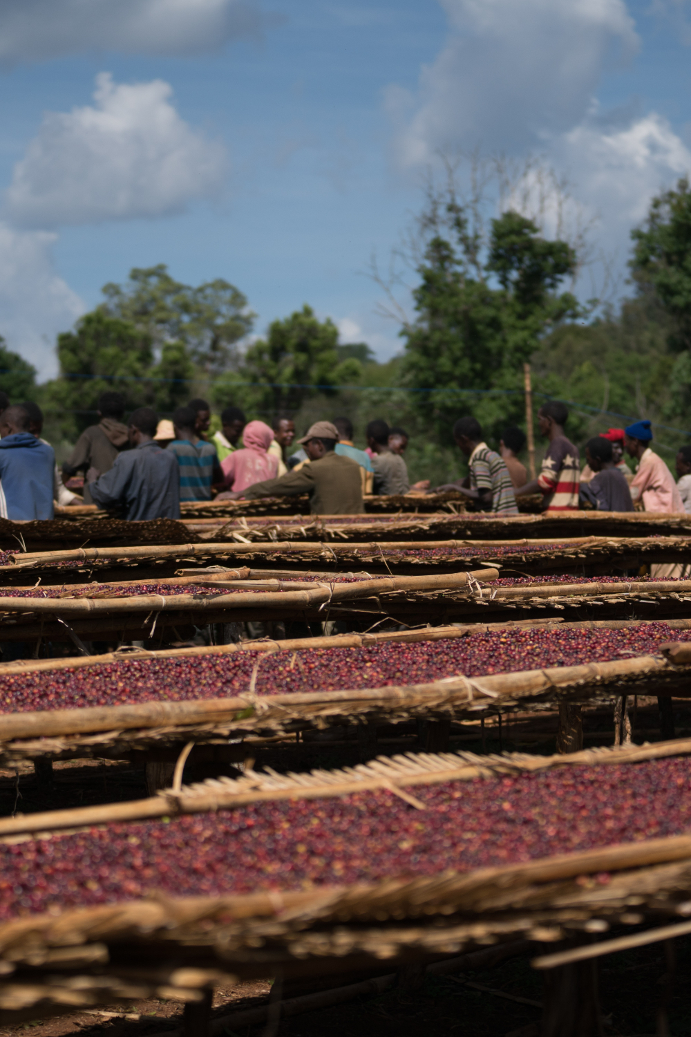 Here, the natural process isn’t just a style choice — it’s a smart, resourceful way to process coffee in a region where water can be scarce. Instead of pulping and washing the fruit away, the cherries are dried whole on raised beds for up to three weeks. It’s a slow, hands-on approach that not only conserves water but also stays true to Ethiopia’s long tradition of sun-dried coffee.